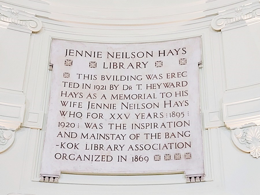 图书馆的命名源于1869 年由13 位英美妇女成立了曼谷女士图书馆协会,旨在发行和共享书籍,后来协会逐渐壮大,需要一个新的图书馆,其中成员珍妮·尼尔森·海斯(Jennie Neilson Hays)曾三度担任协会总裁,但却于1920 年去世,她的先生就建立此图书馆来纪念妻子,可说是一份爱的礼物。