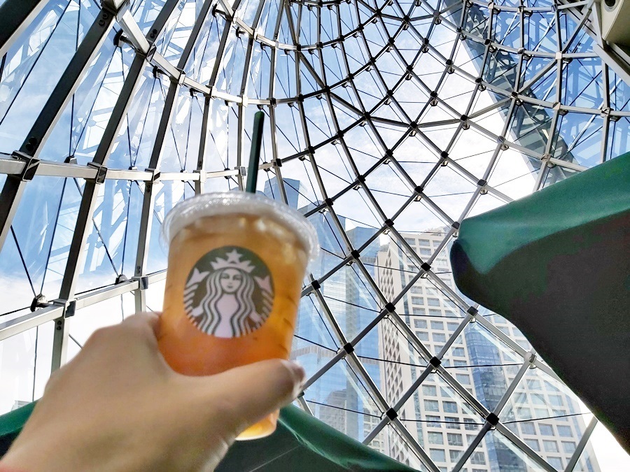 这间星巴克位于捷运站旁的Sathorn Square大楼内部,圣诞树造型(也可说是竹笋啦)的外观以玻璃帷幕拼成,约有四五层楼高,从内部看上去,弧形的钢骨结构形成优美的曲线延伸到顶部,交织成漂亮的几何图案。