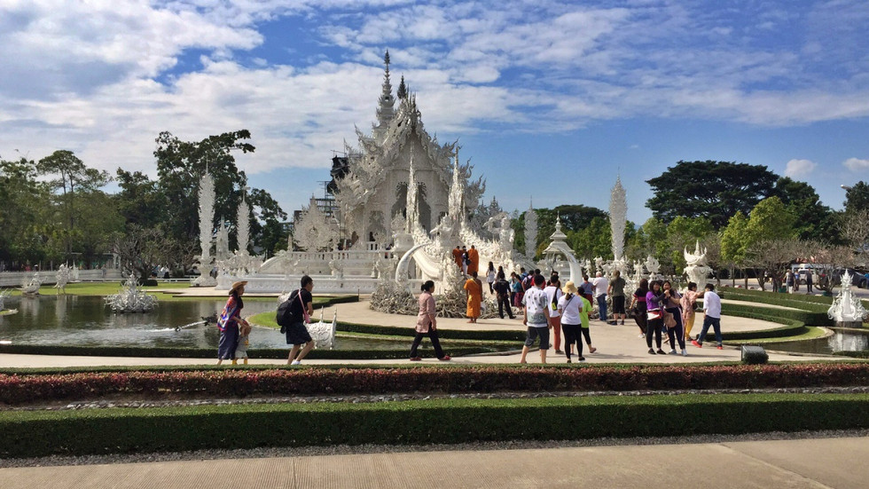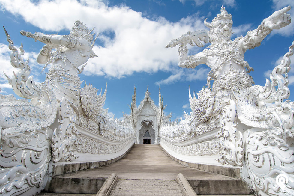 清莱的灵光寺(Wat Rong Khun;วัดร่องขุ่น)以纯白独树一帜,阳光下,这座白色的庙宇徜徉在蔚蓝的天空,闪着炫目耀眼光芒,就像一件美丽的艺术作品。